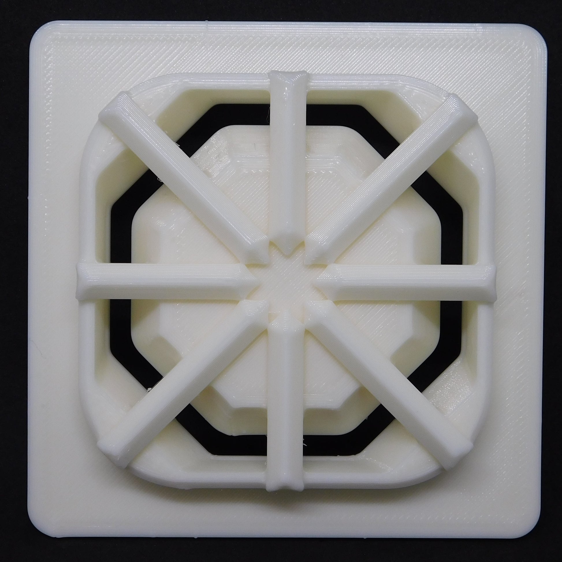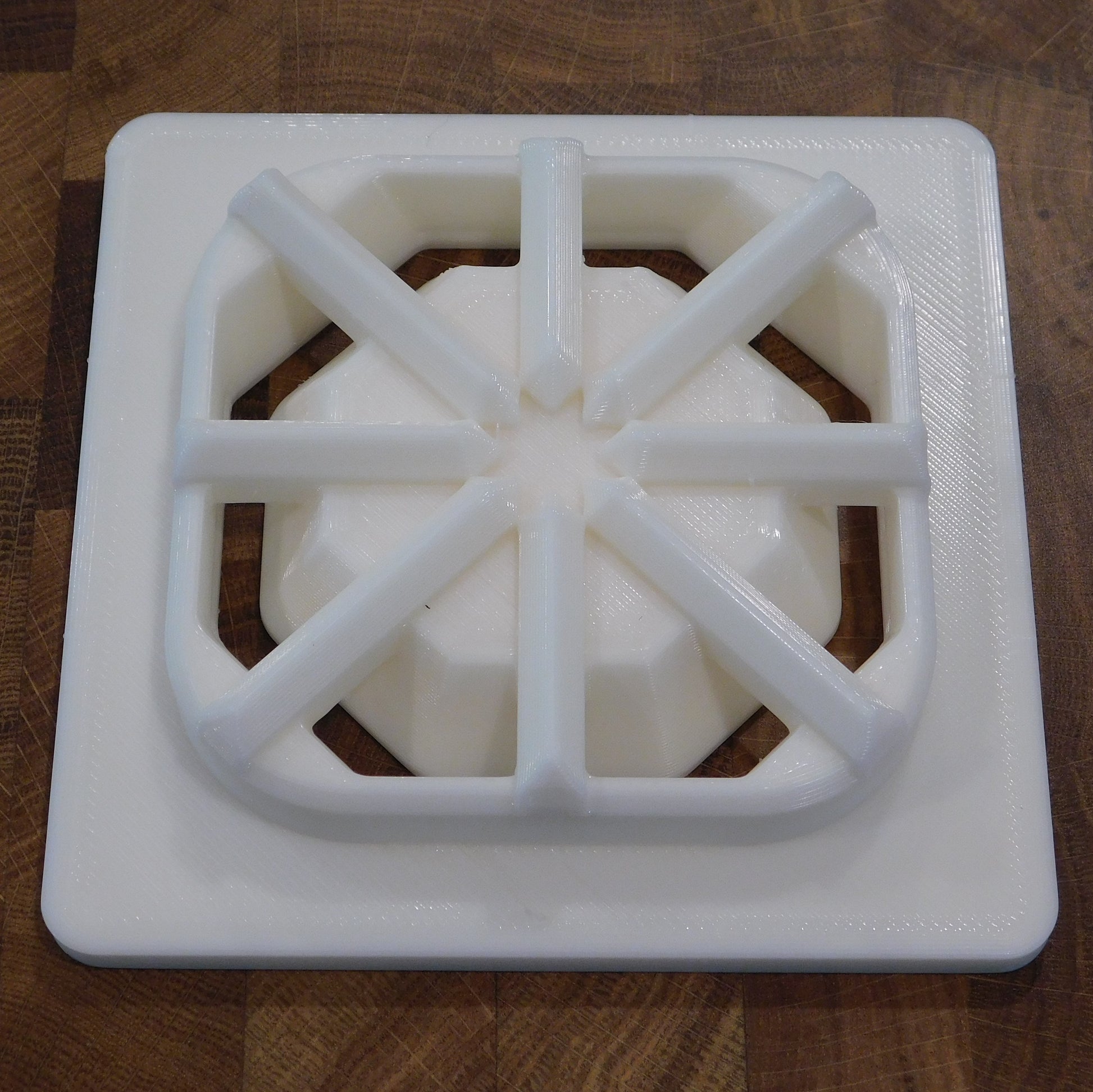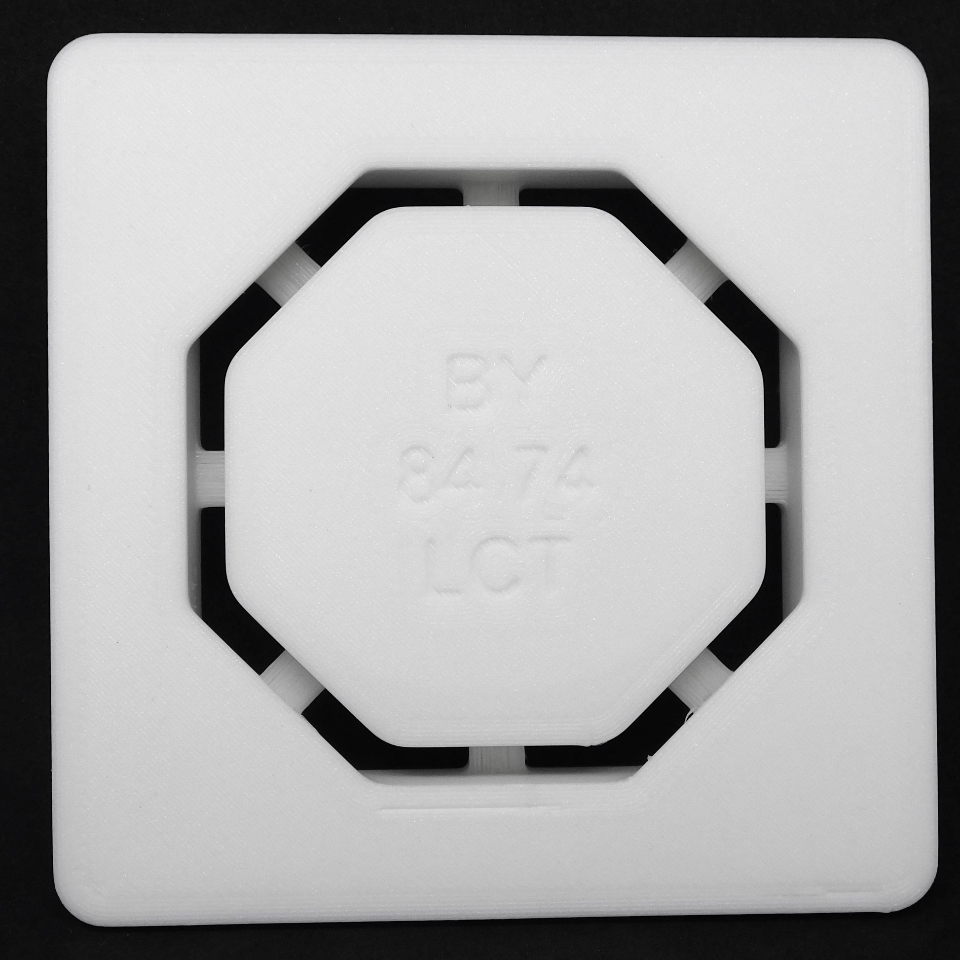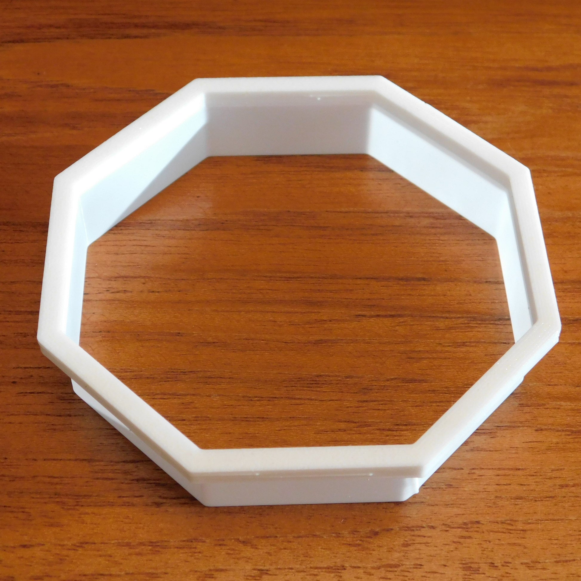 Extrusion Dimensions: The inner width of the extruded shape is 74mm (~2 7/8") and the outer width is 84mm (~3 1/4"). The inner corners of the octagon are rounded to prevent the clay from splitting during extrusion. The low wall around the top of the die prevents clay from oozing out sideways, as sometimes happens with square extruders.