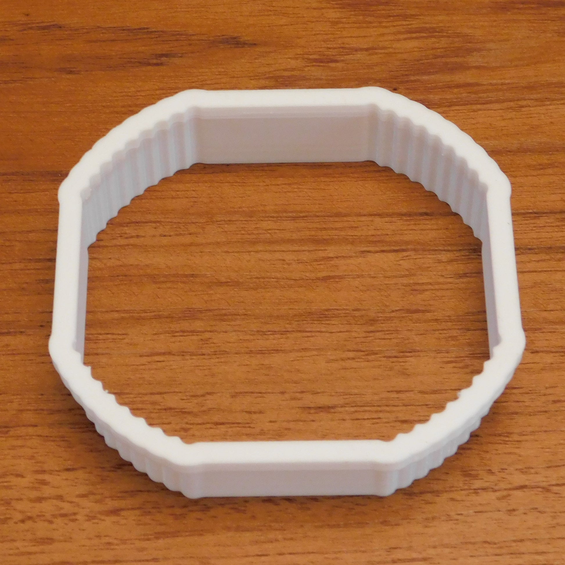 This die extrudes a shape that is a square with rounded corners. The corners also have vertical ridges on the outside. It fits in 4" square Bailey clay extruders.