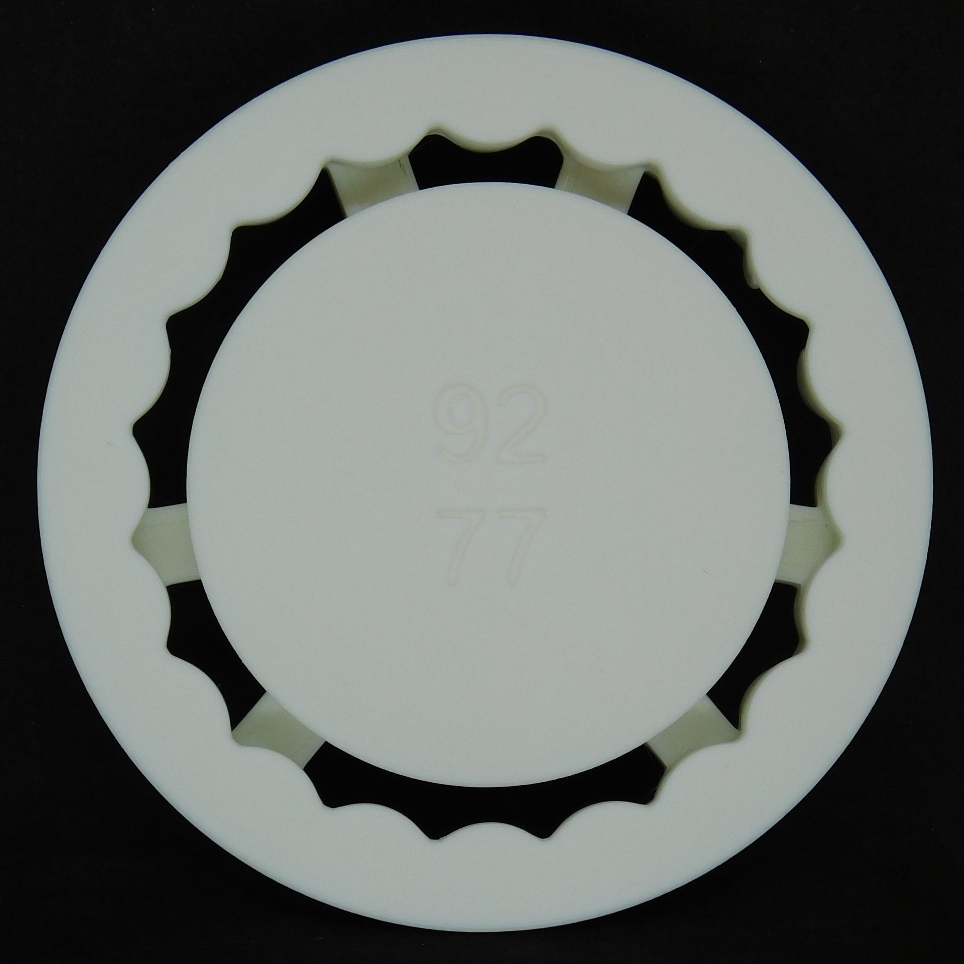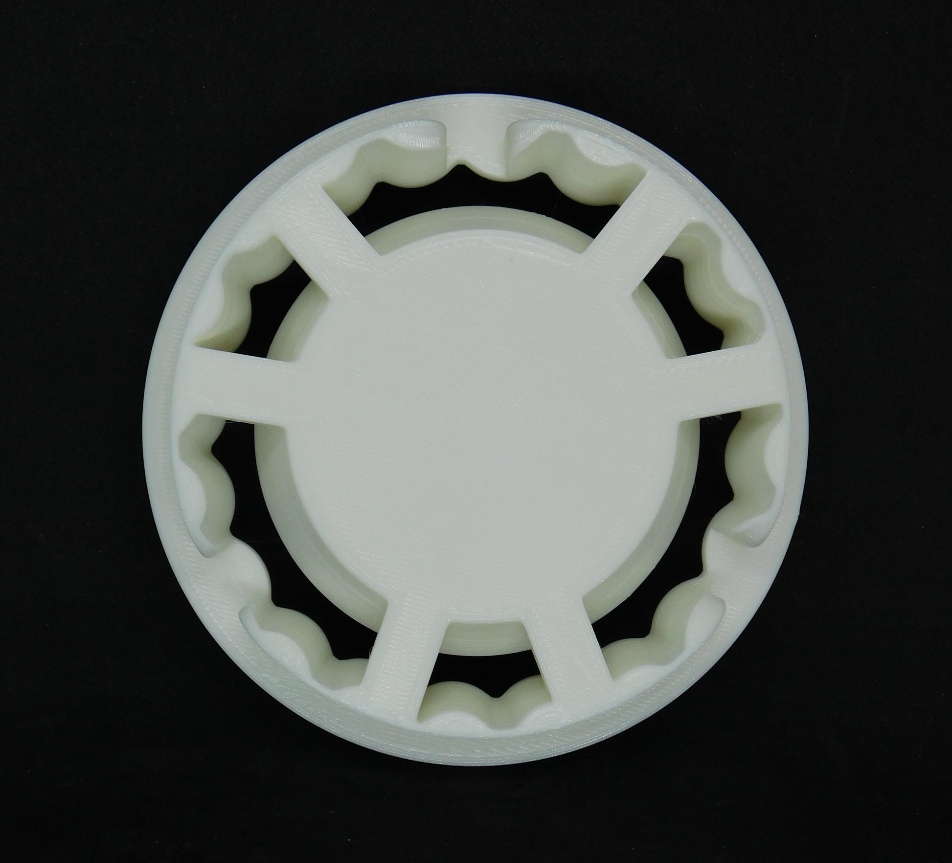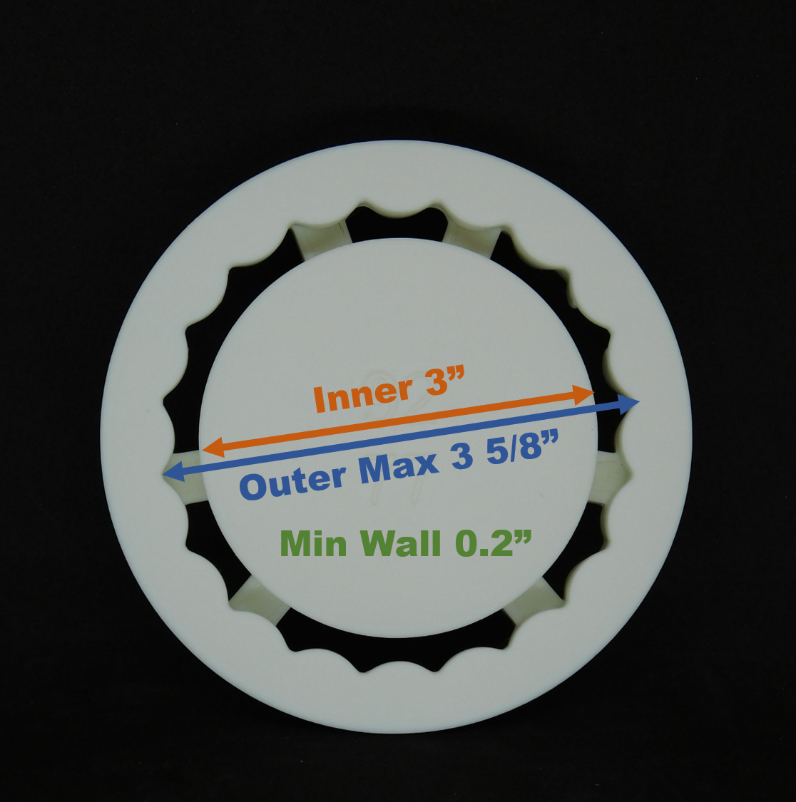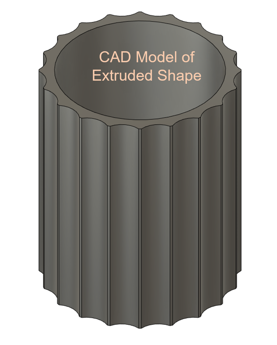 This die extrudes a fluted shape. The inner shape is a smooth circle. The die is compatible with 4" round Scott Creek clay extruders.