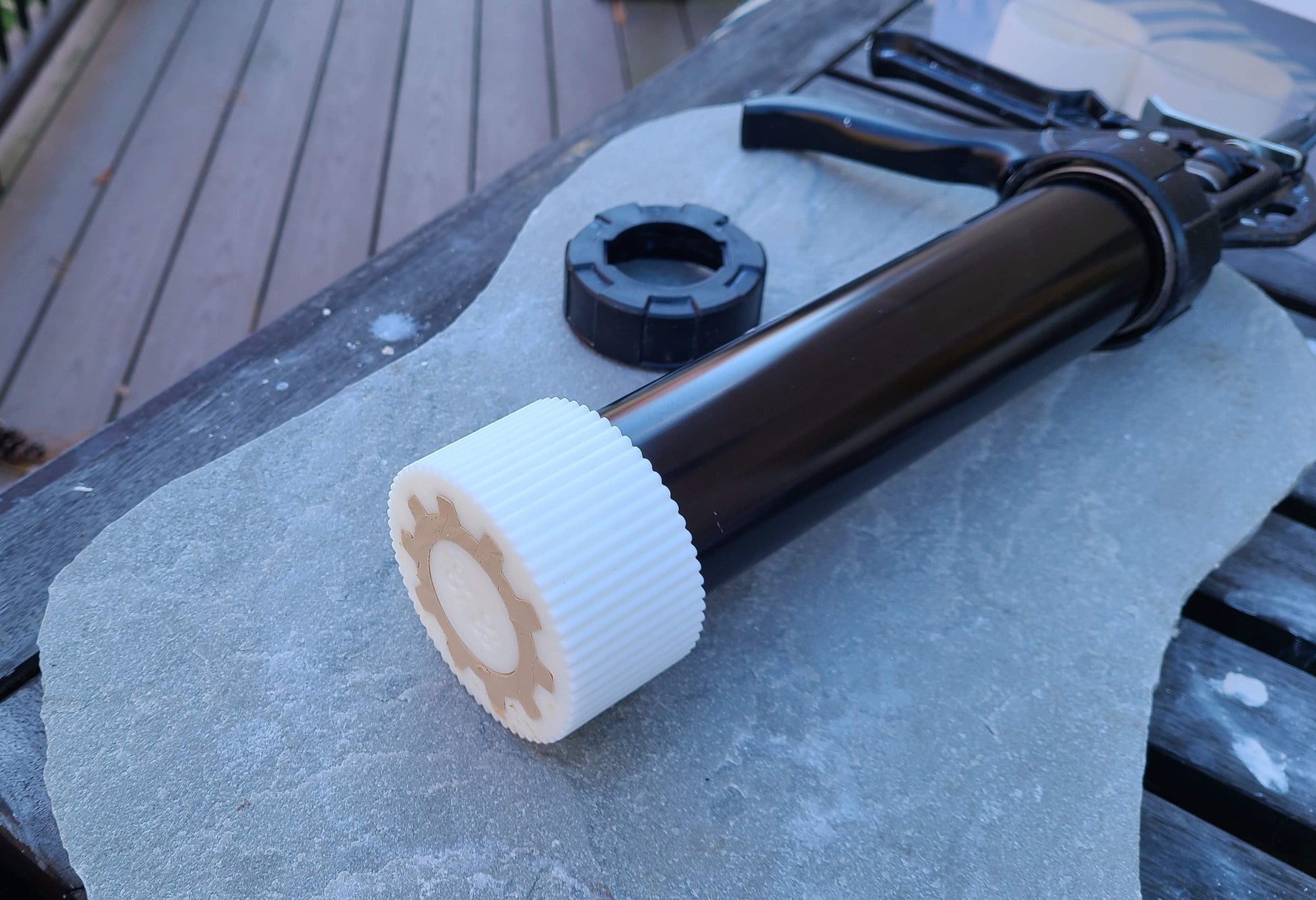 The die and cutter are 3D-printed using PLA filament. PLA is a plastic made from starch (not petrochemicals) and is compostable in industrial composters.