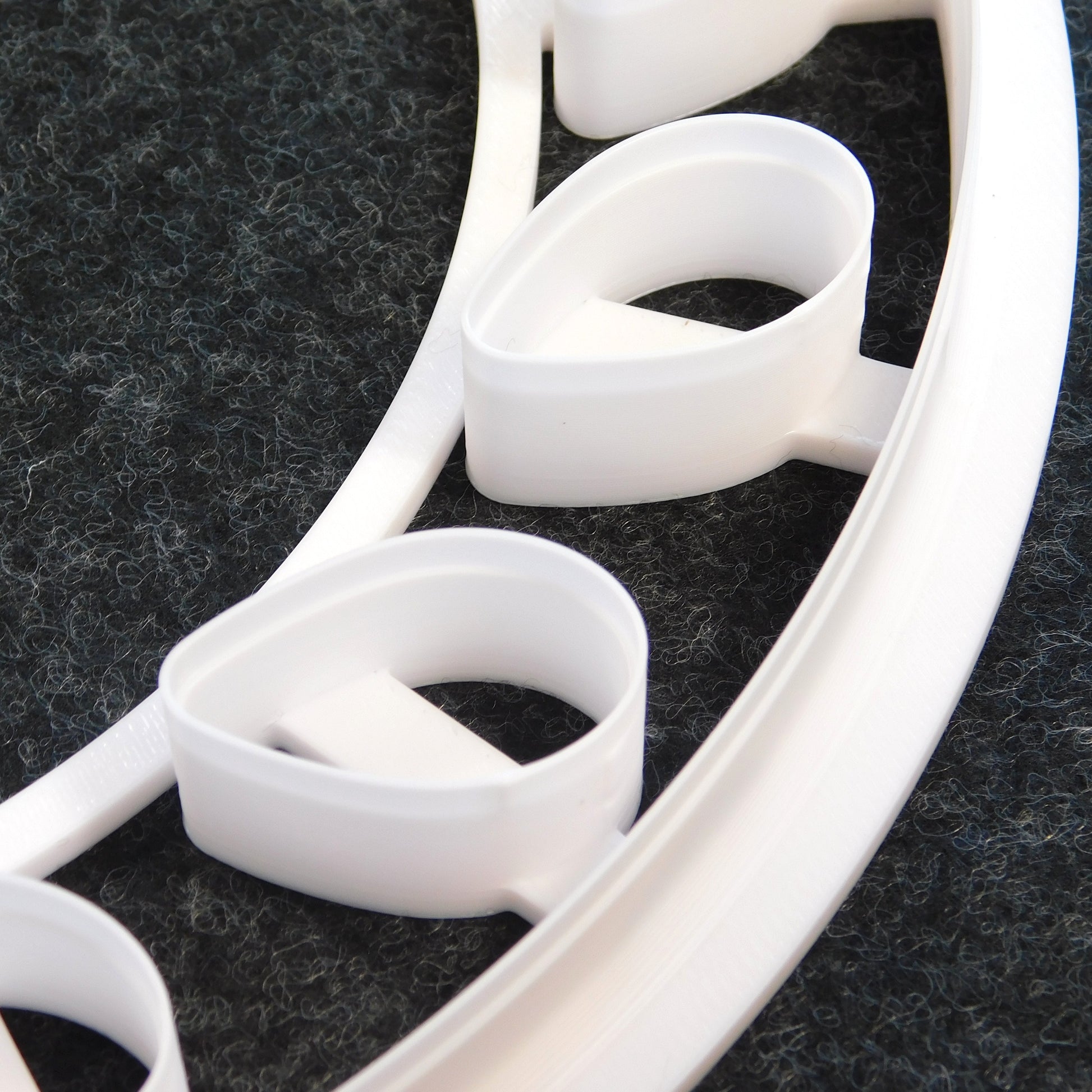The die and cutter are 3D-printed using PLA filament. PLA is a plastic made from starch (not petrochemicals) and is compostable in industrial composters.