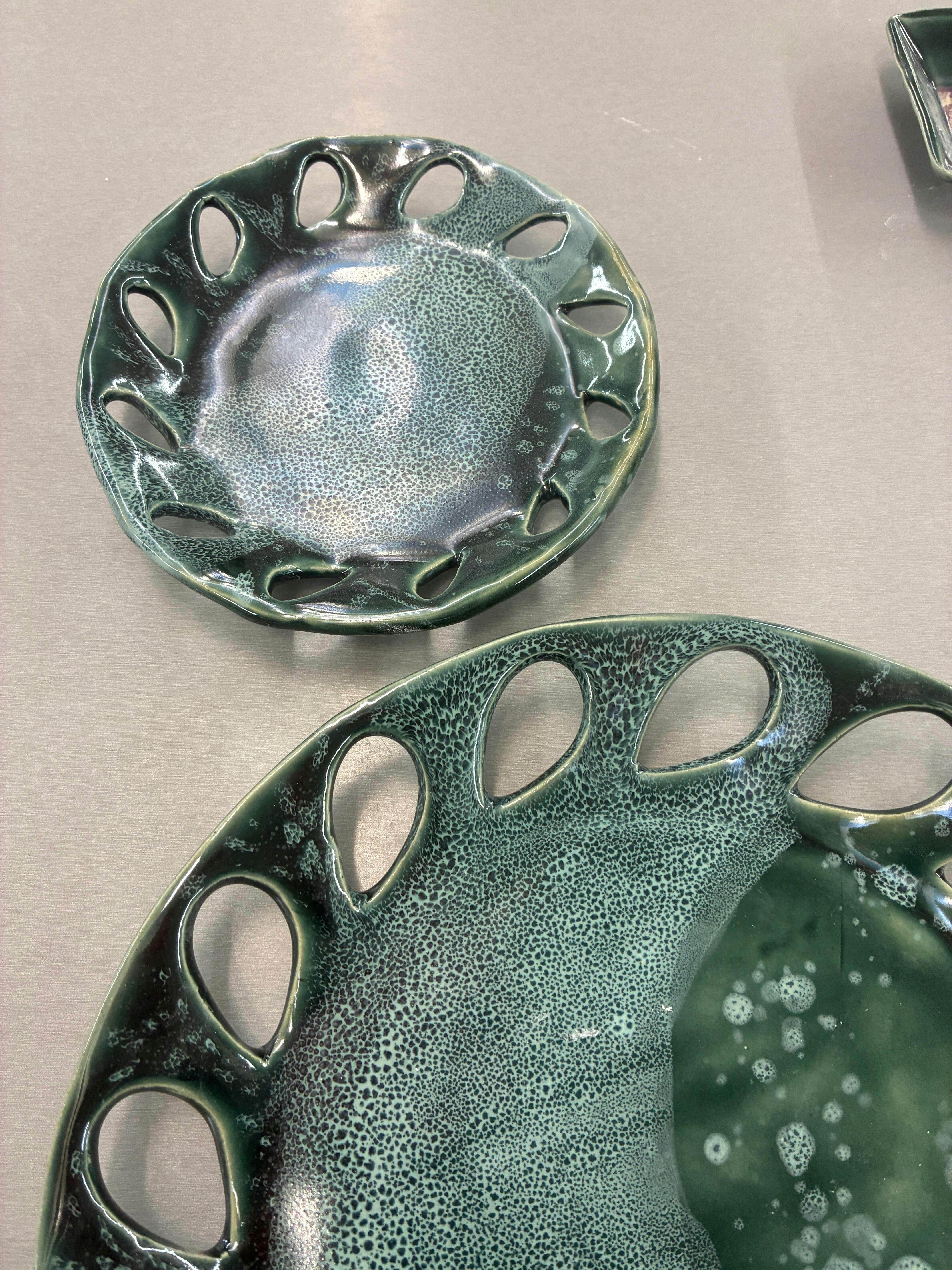 The beautifully glazed plate is by Janet Chiovoloni. Janet's tip: Be sure to use thin plastic to cover the clay and prevent it from sticking to the cutter. The thin plastic can be from dry cleaner bags, plastic wrap, or similar.