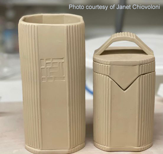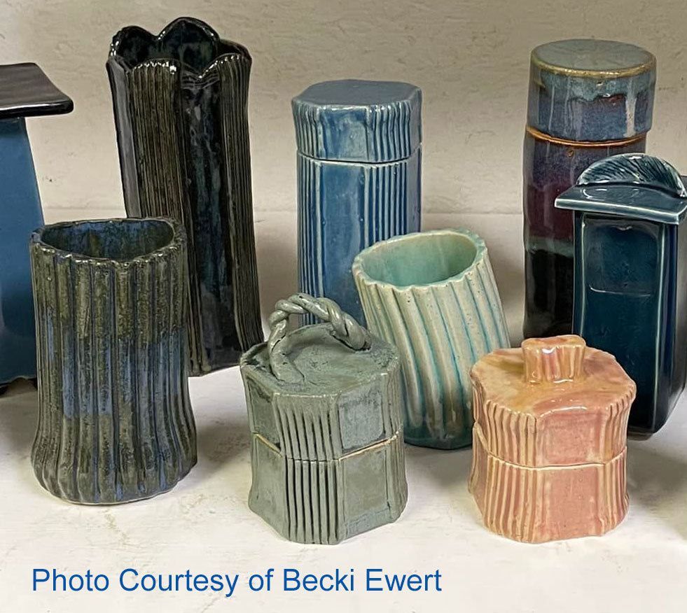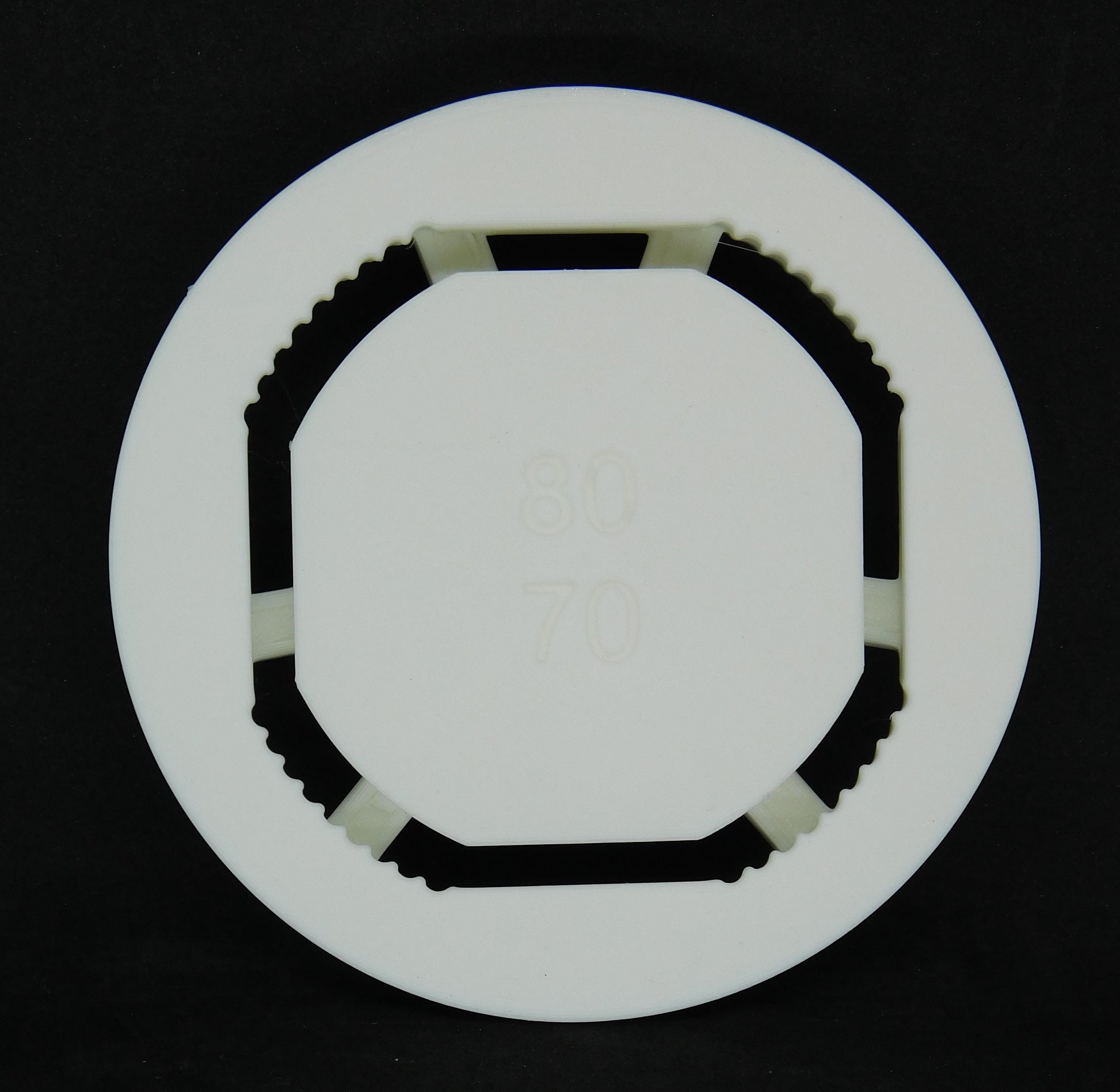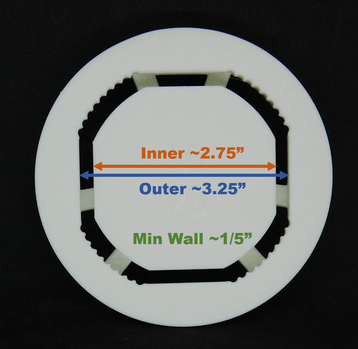 This die extrudes a shape that is a square with rounded corners. The corners also have vertical ridges on the outside. The die is compatible with 4" round Scott Creek clay extruders.