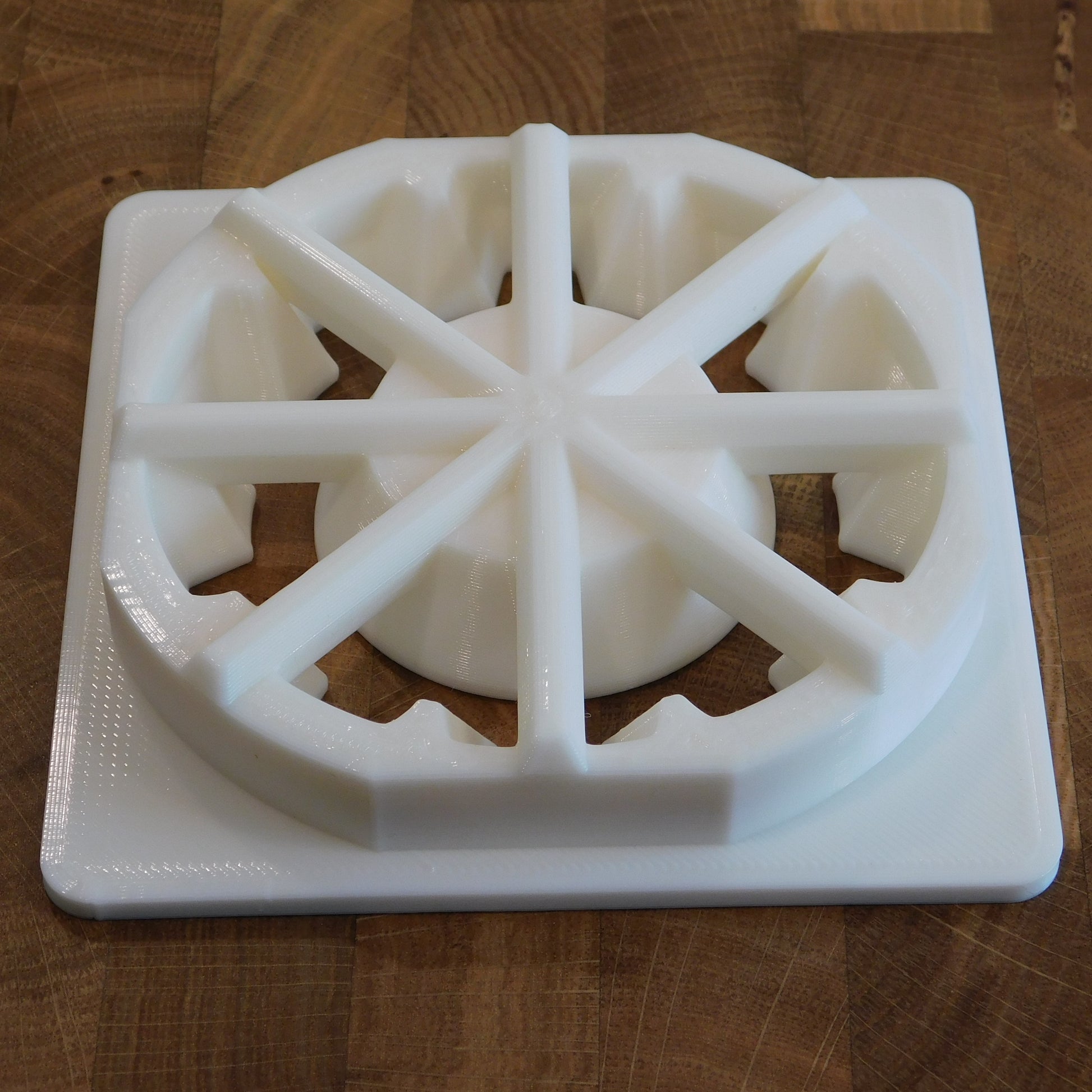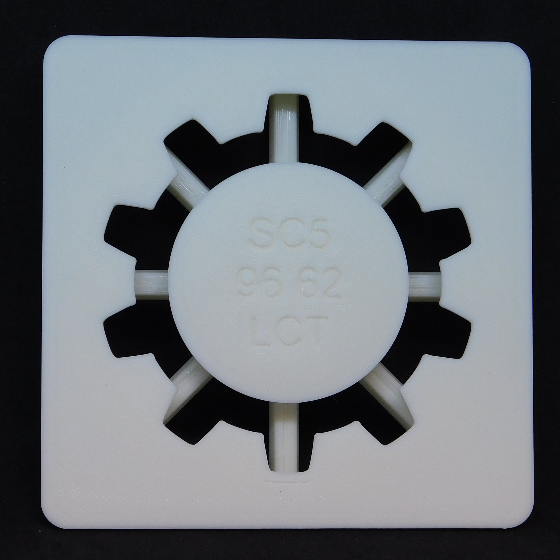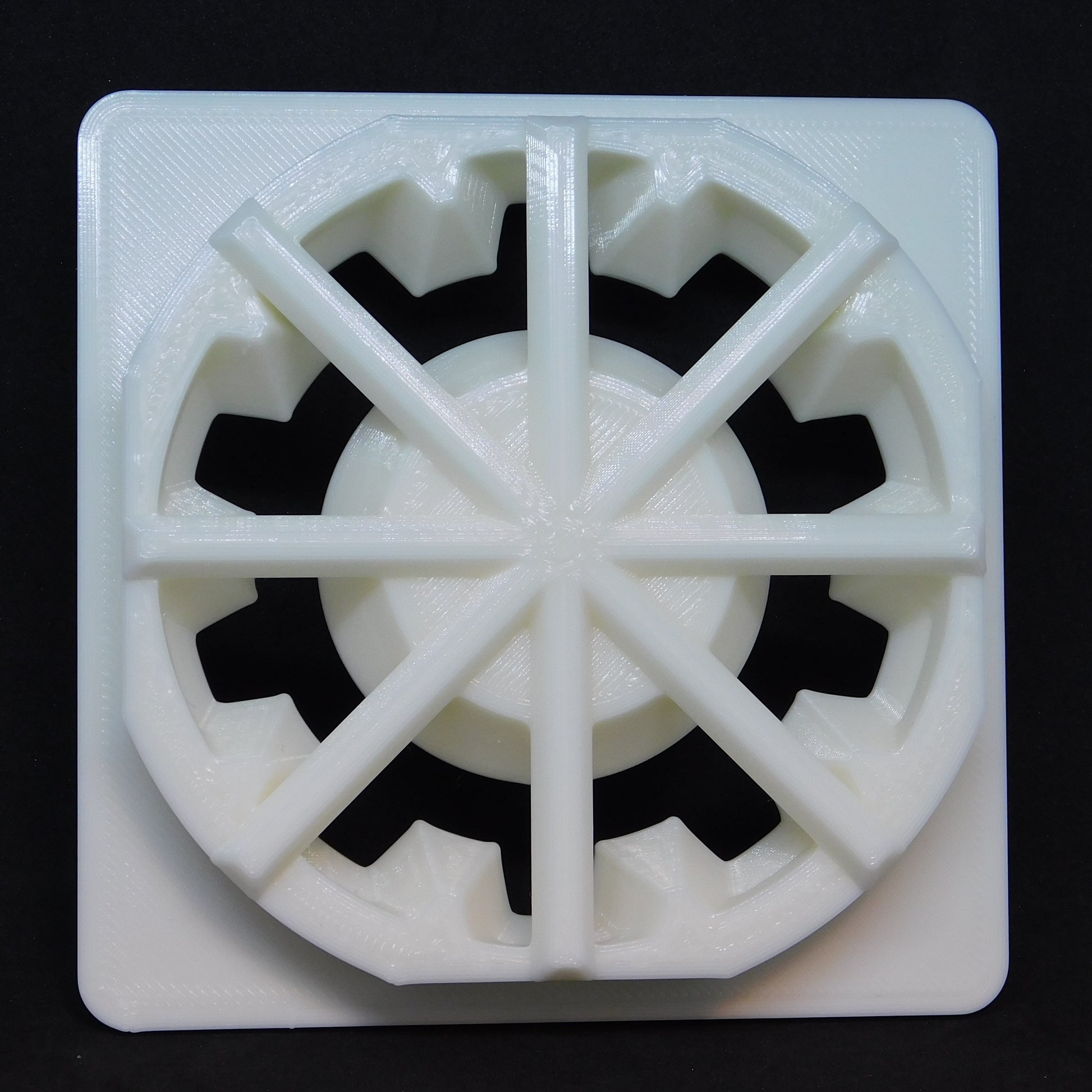 This die extrudes a gear or "spoked-wheel" shape. The inner shape is a smooth circle. It fits in 5" square Scott Creek clay extruders.