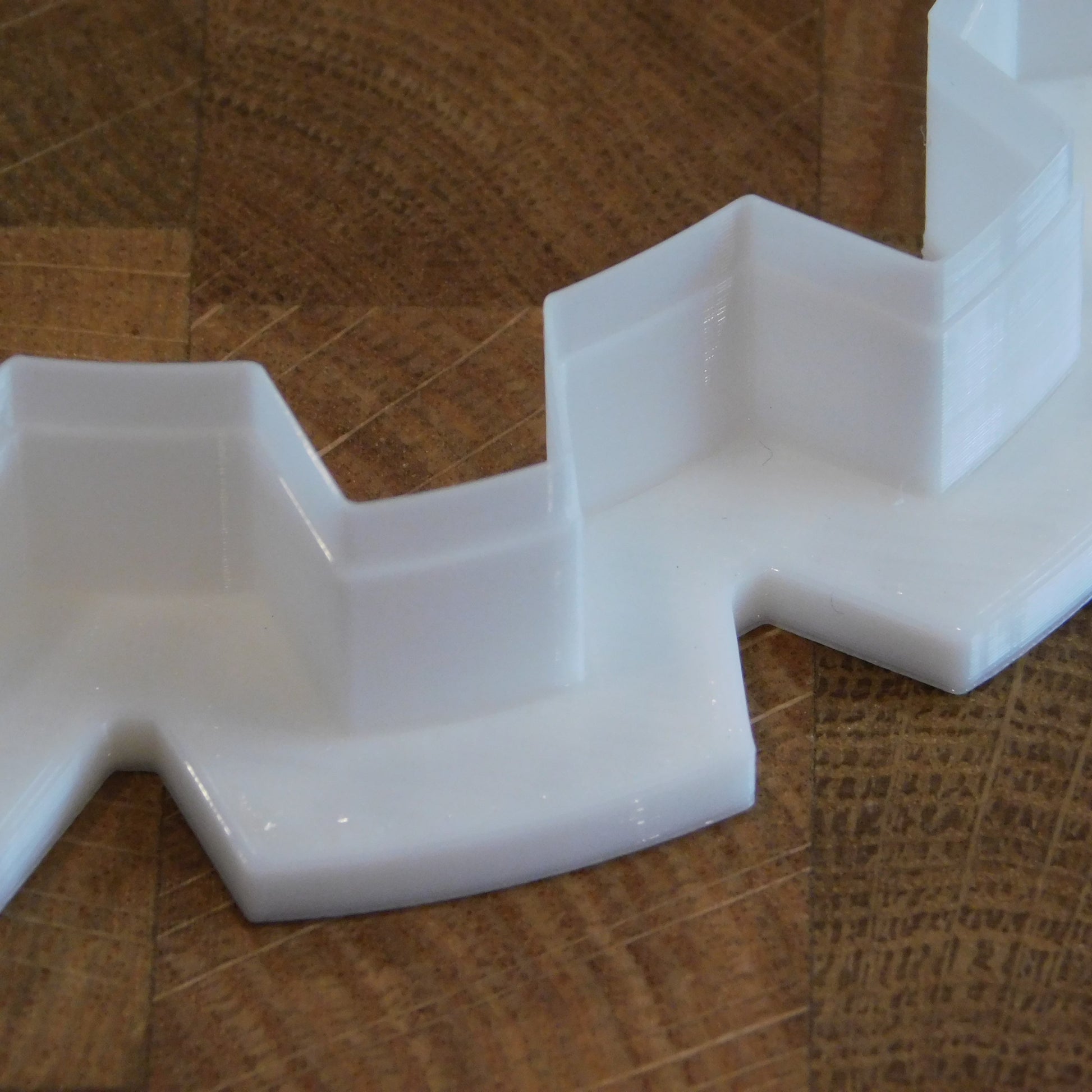 The die and cutter are 3D-printed using PLA filament. PLA is a plastic made from starch (not petrochemicals) and is compostable in industrial composters.