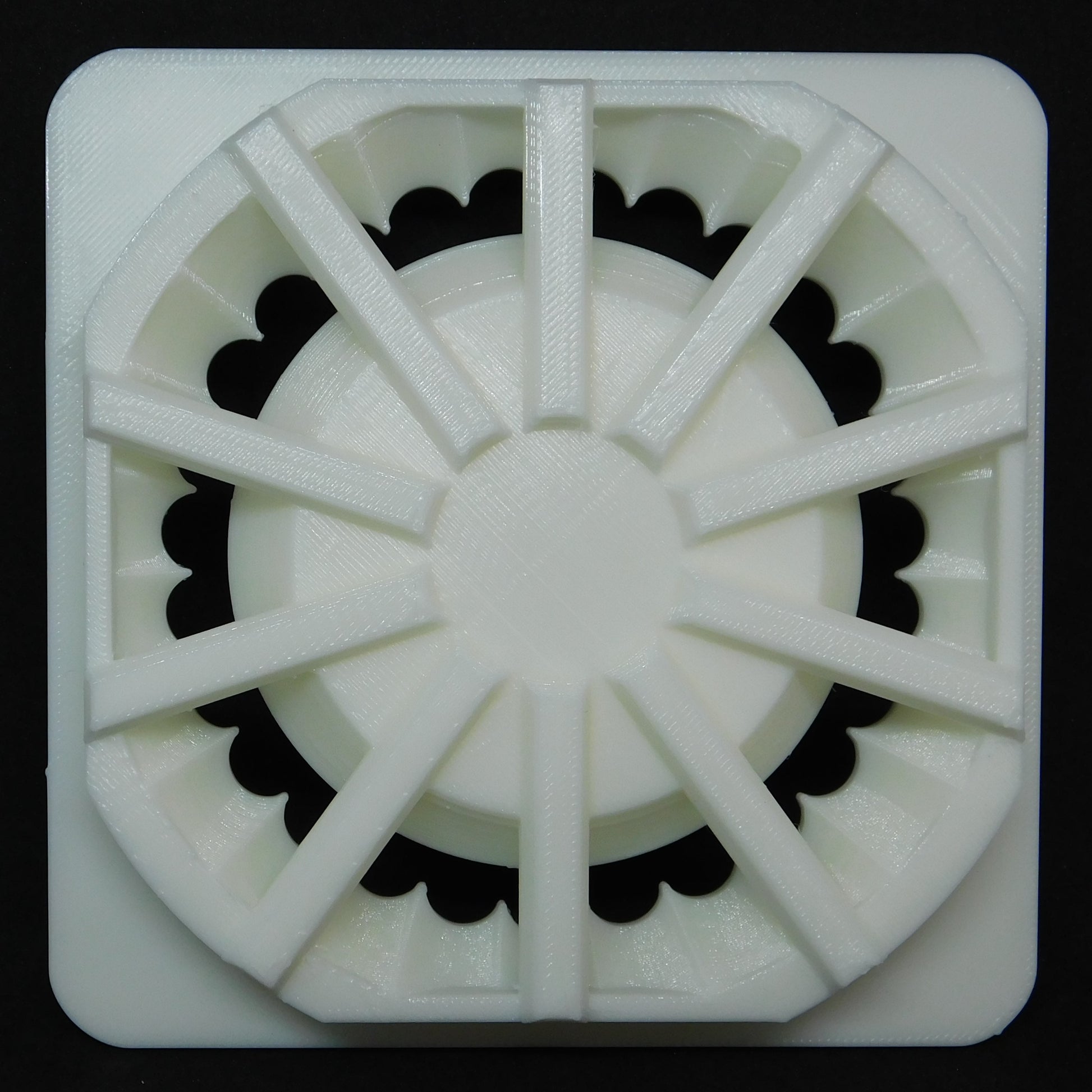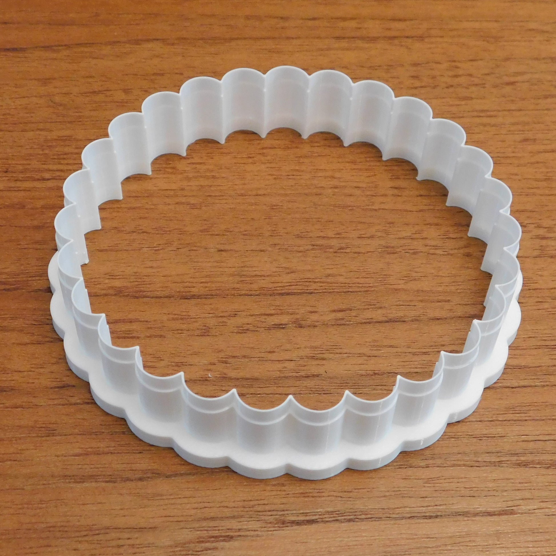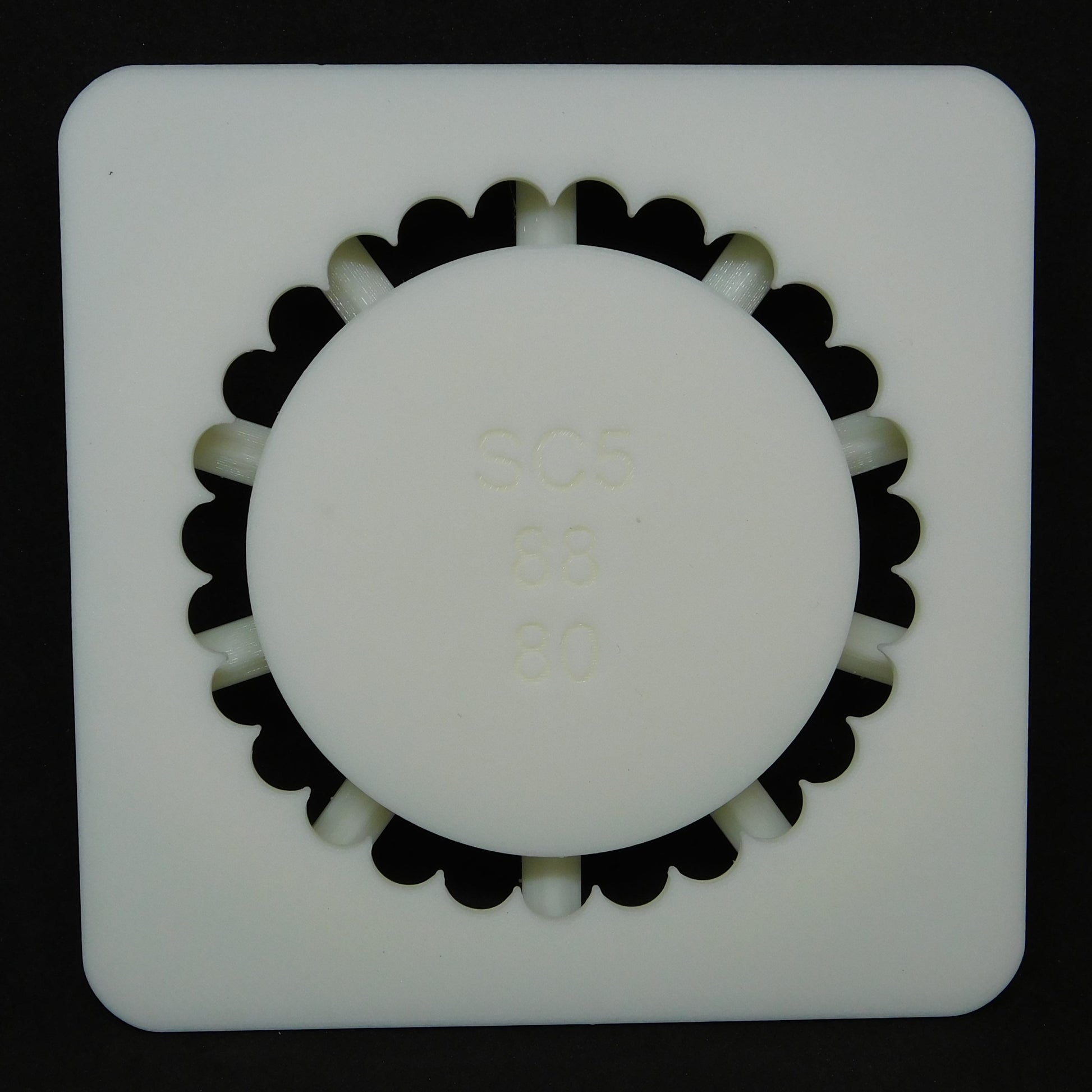 This die extrudes a scalloped shape. The inner shape is a smooth circle. It fits in 5" square Scott Creek clay extruders.