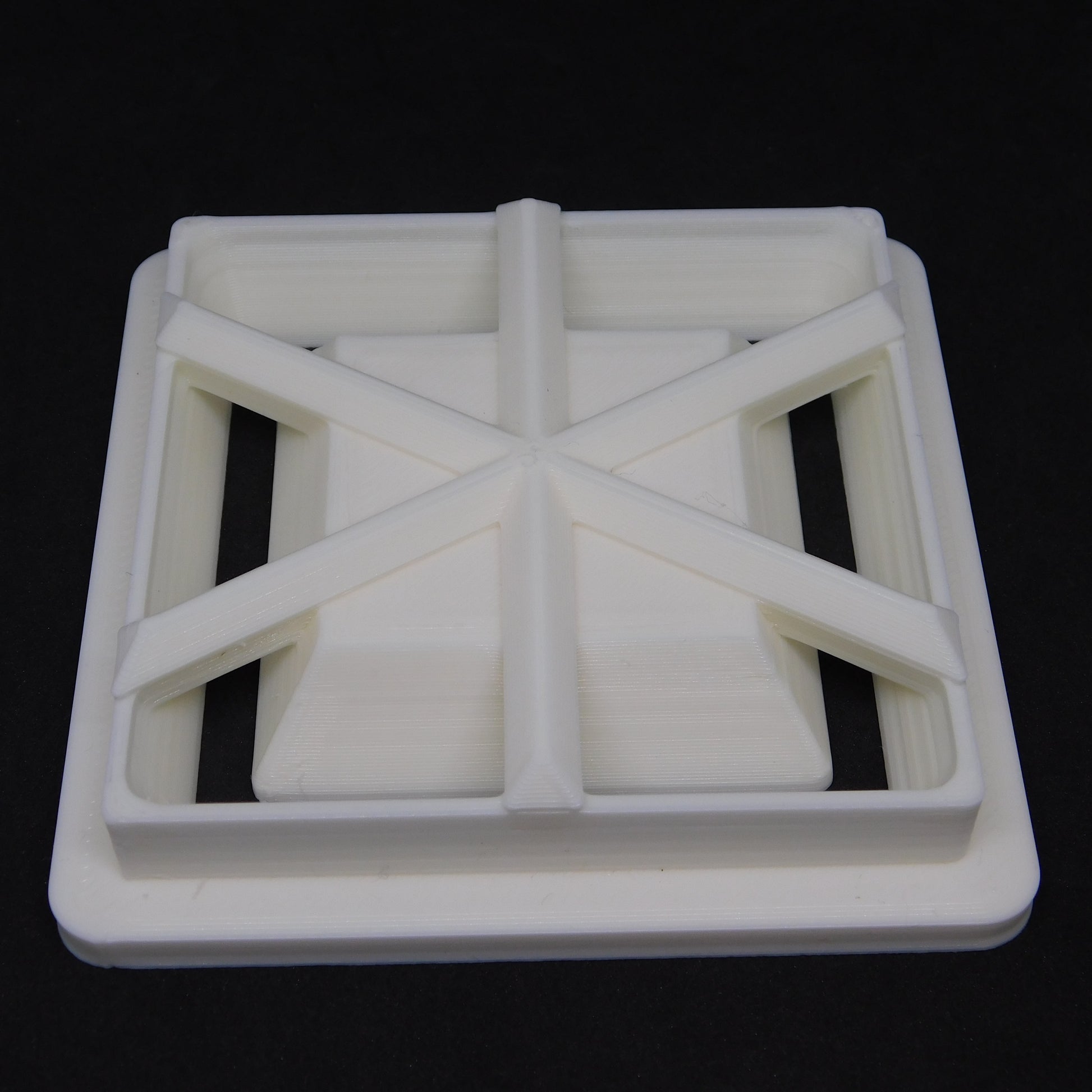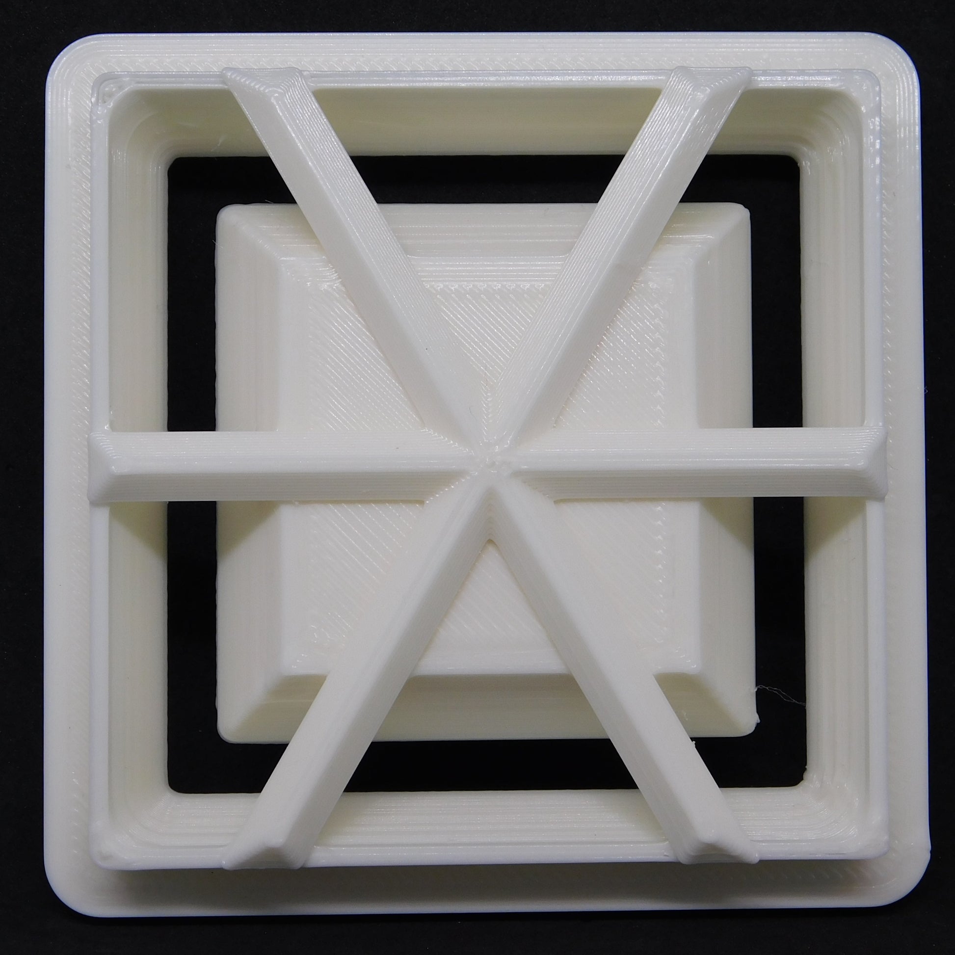 This die extrudes a square hollow shape. The inside corners are rounded to prevent the extrusion from splitting. The die fits in NorthStar and TA Metal Works 4" square clay extruders.
