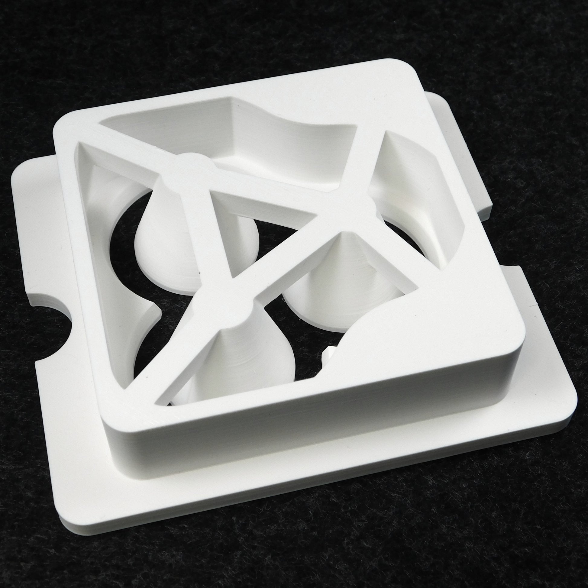The die and cutter are 3D-printed using PLA filament. PLA is a plastic made from starch (not petrochemicals) and is compostable in industrial composters.