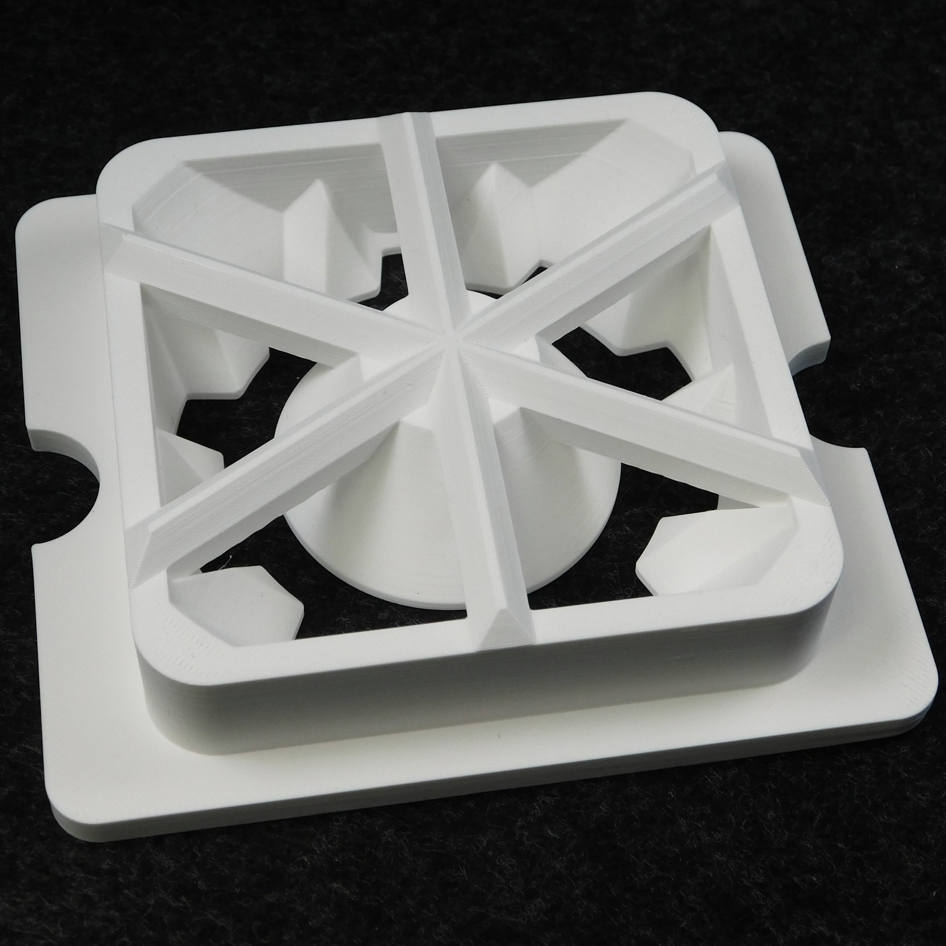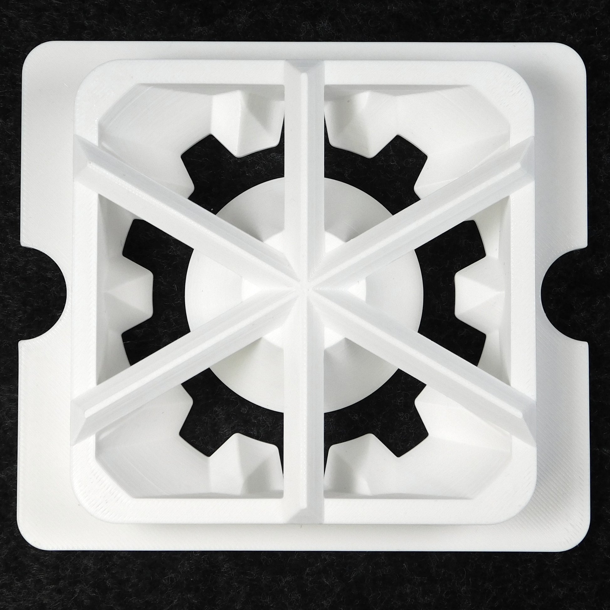 This die extrudes a gear or "spoked-wheel" shape. The inner shape is a smooth circle. The die fits in most 4" square wall-mounted clay extruders including: NorthStar, Bailey, TA Metal Works, and the Amazon generic model.