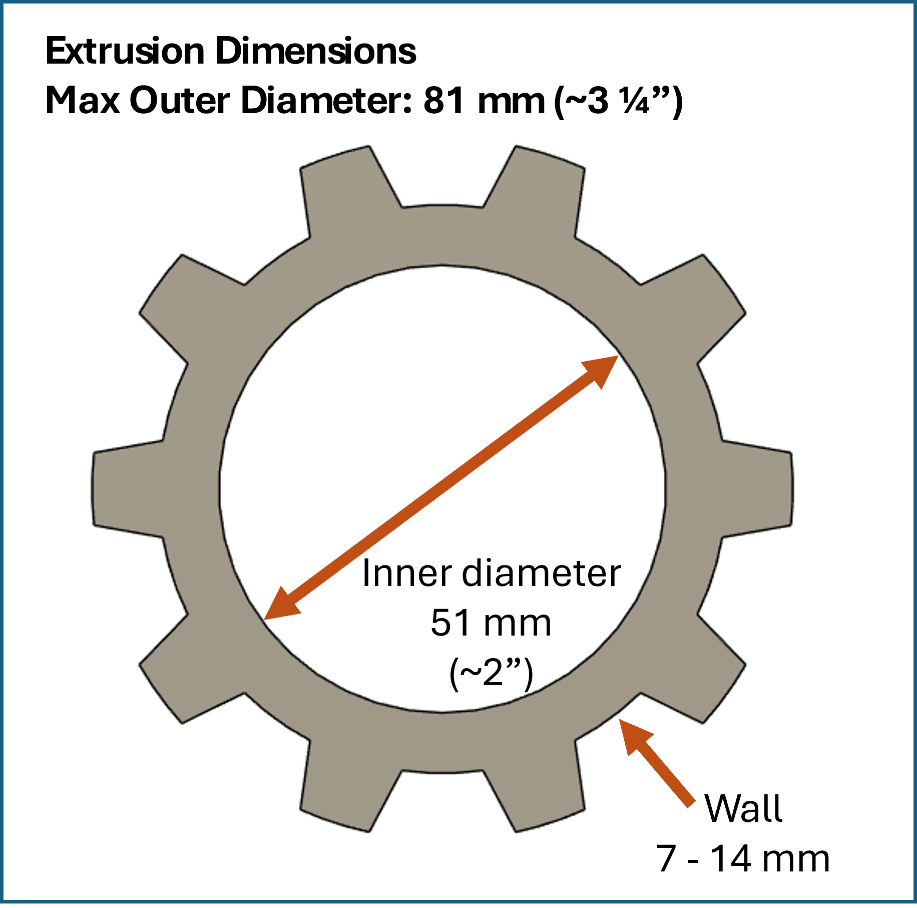 Extrusion Dimensions: The maximum outer diameter is 81 mm (~3 1/4"). The inner diameter is 2 1/2", and the wall is 7 - 14 mm thick.