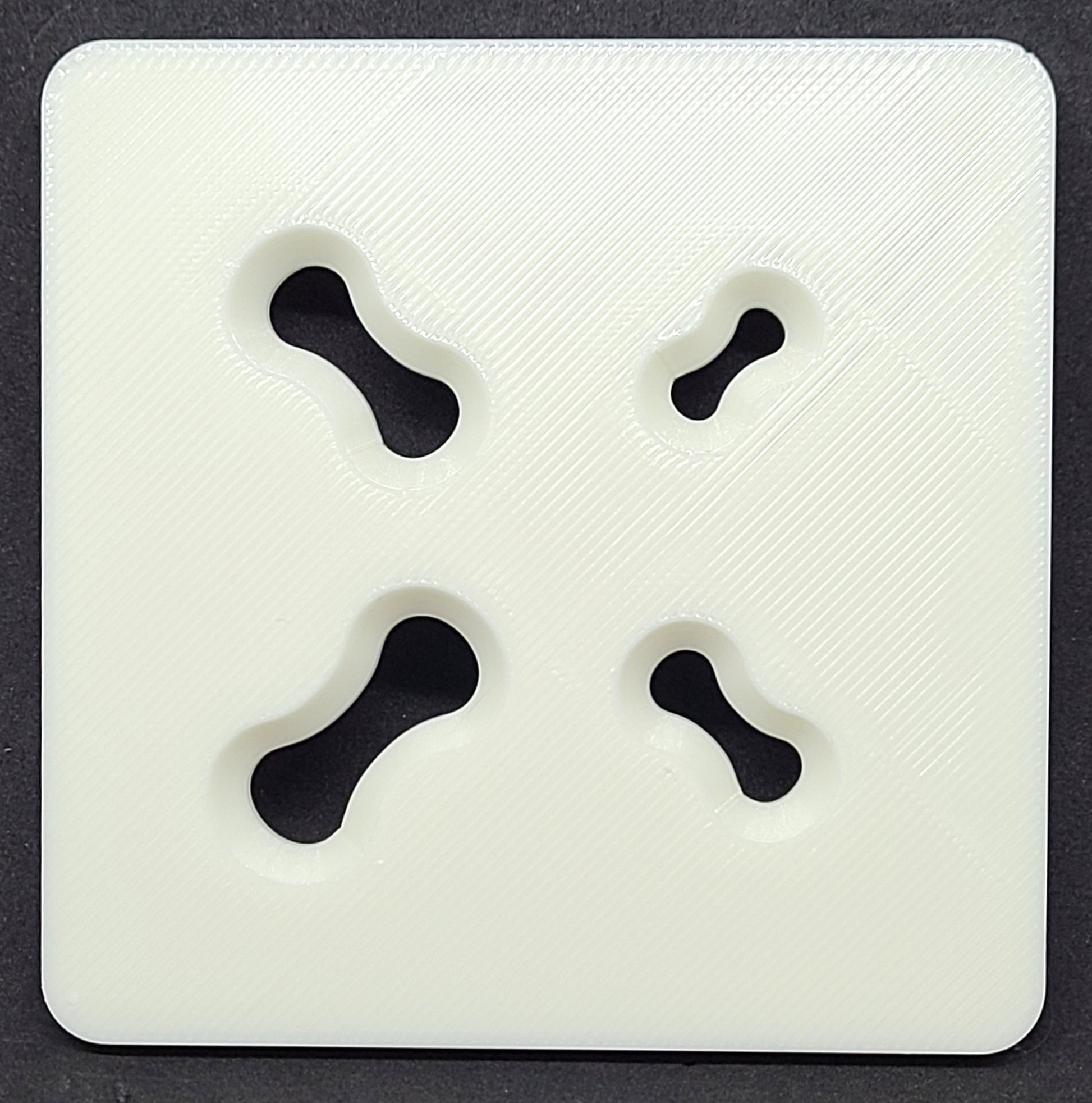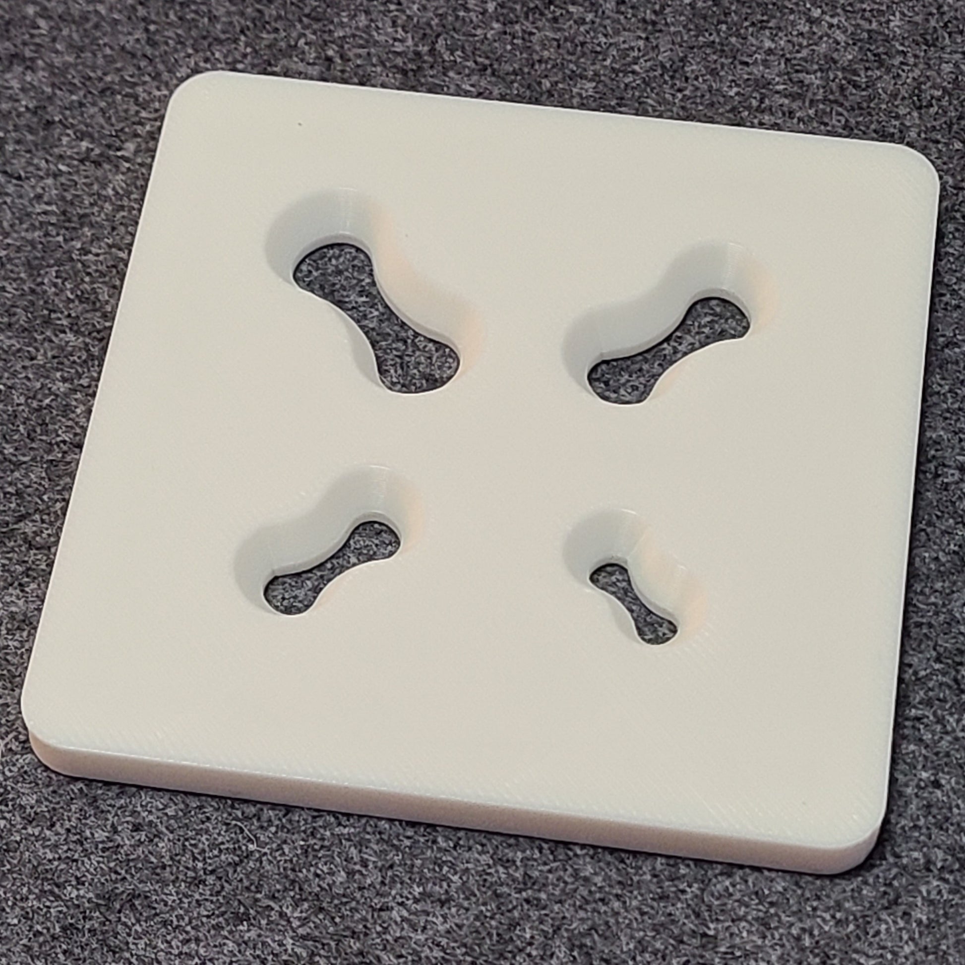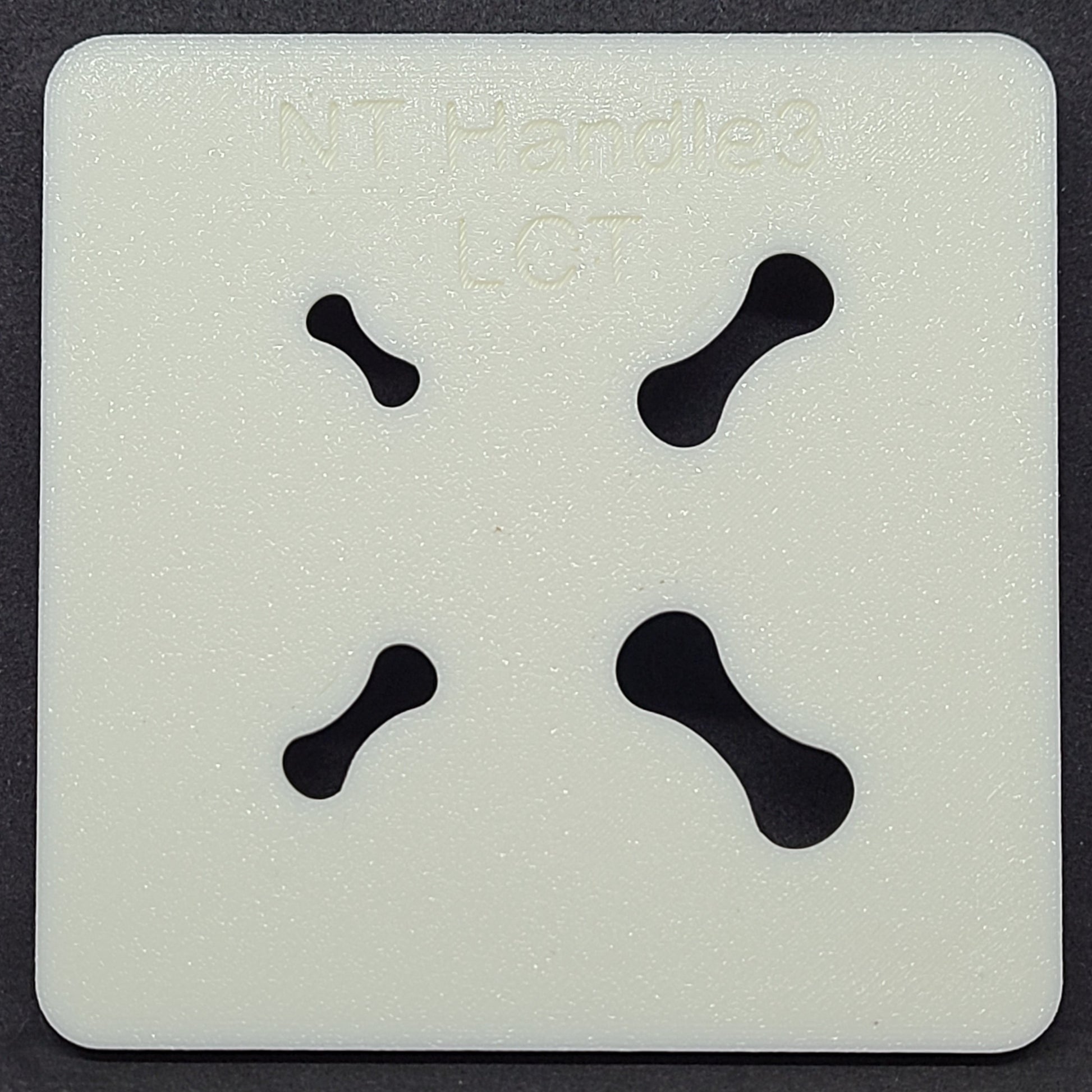 This die extrudes four handle shapes. Each shape is a "dogbone" shape, and there are four sizes: 15, 20, 25, and 25 mm wide. This die fits in NorthStar and TA Metal Works 4" square clay extruders.