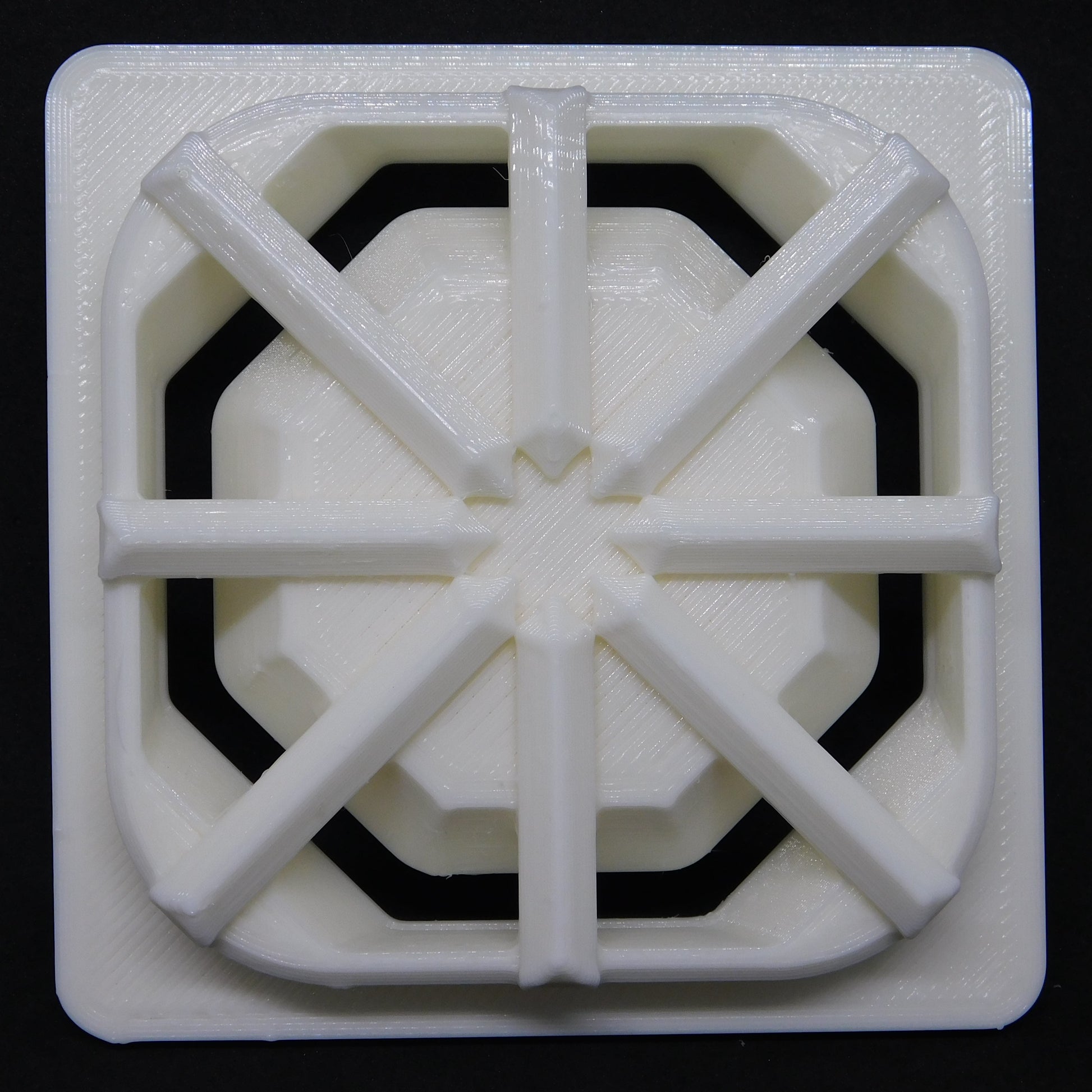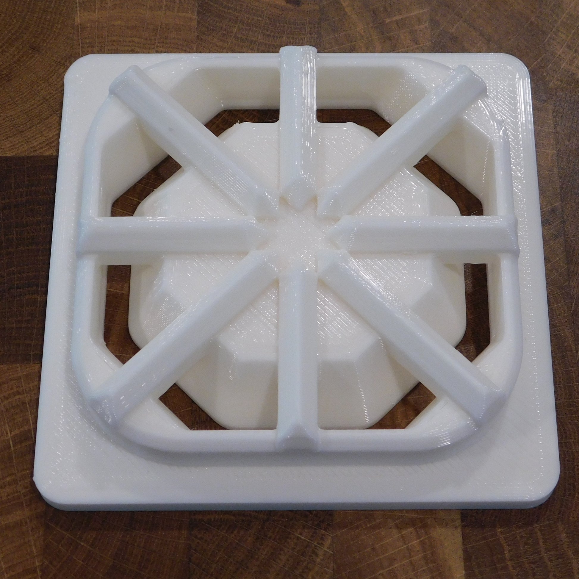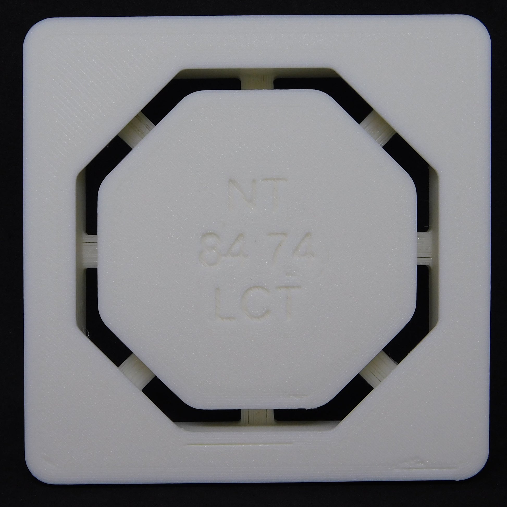 Extrusion Dimensions: The inner width of the extruded shape is 74mm (~2 7/8") and the outer width is 84mm (~3 1/4"). The inner corners of the octagon are rounded to prevent the clay from splitting during extrusion. The low wall around the top of the die prevents clay from oozing out sideways, as sometimes happens with square extruders.