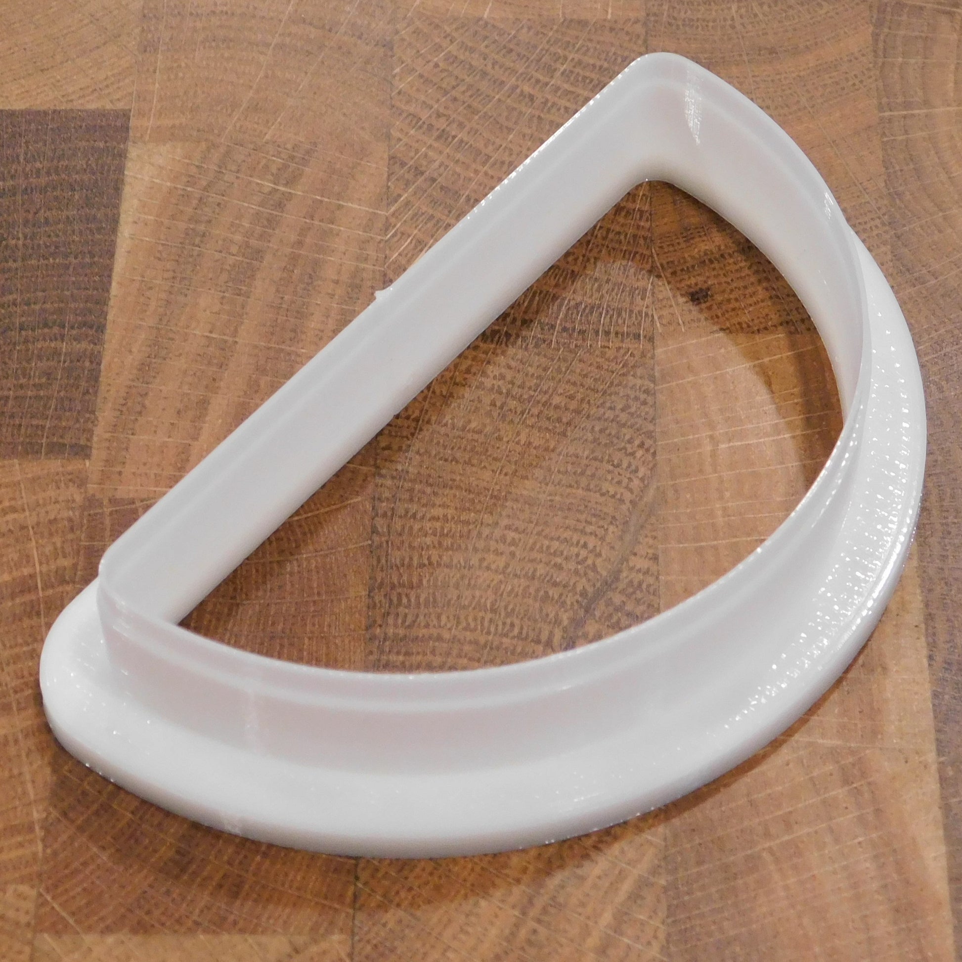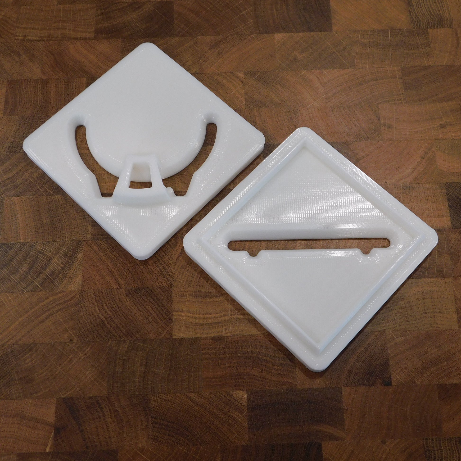The die and cutter are 3D-printed using PLA filament. PLA is a plastic made from starch (not petrochemicals) and is compostable in industrial composters.