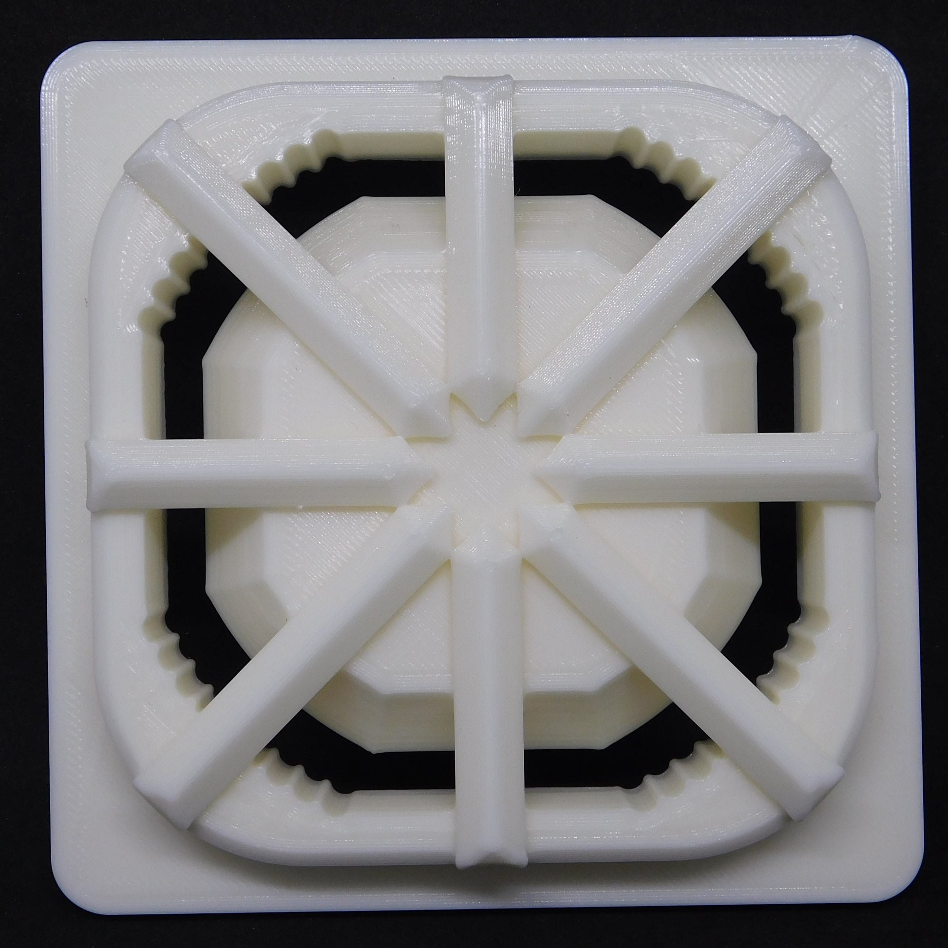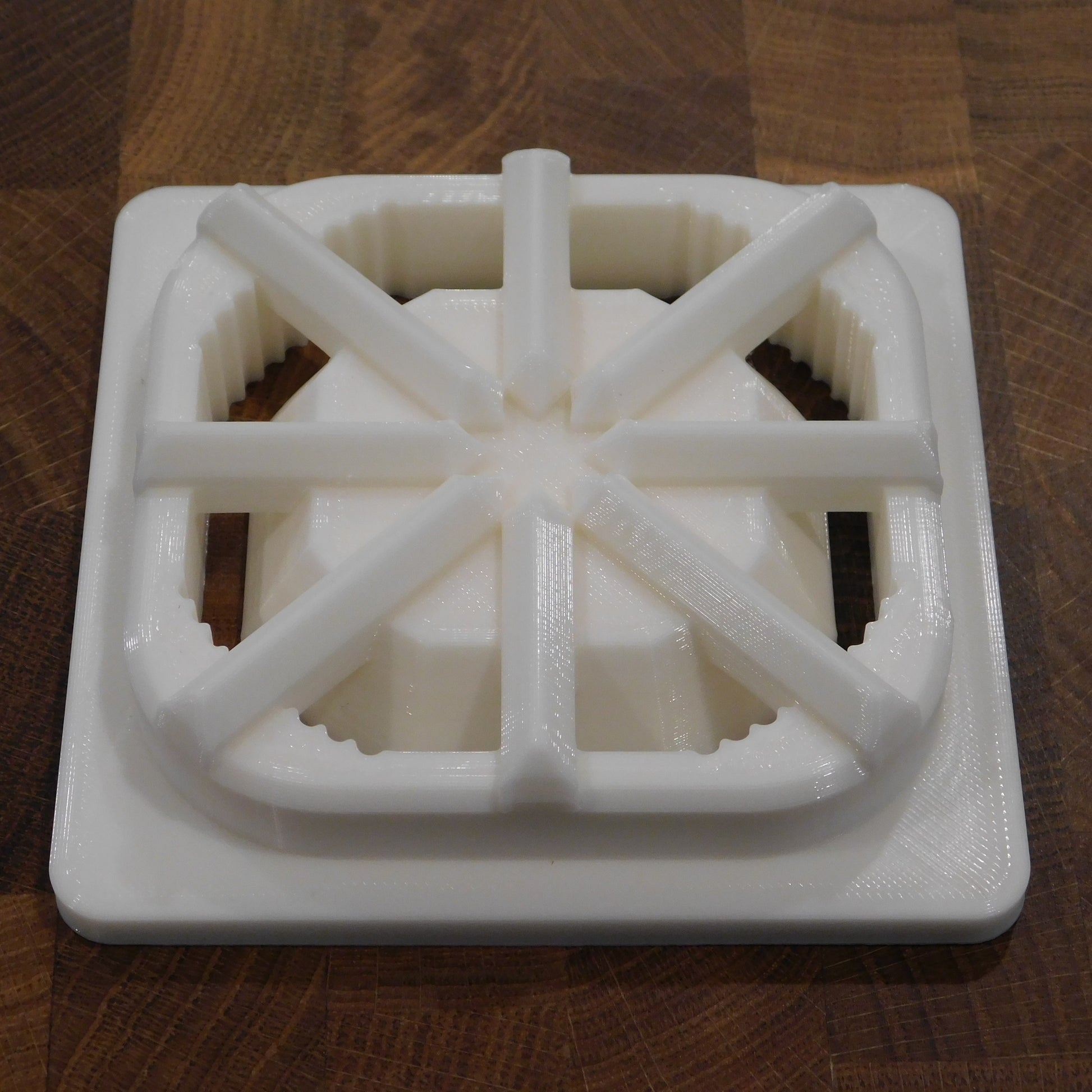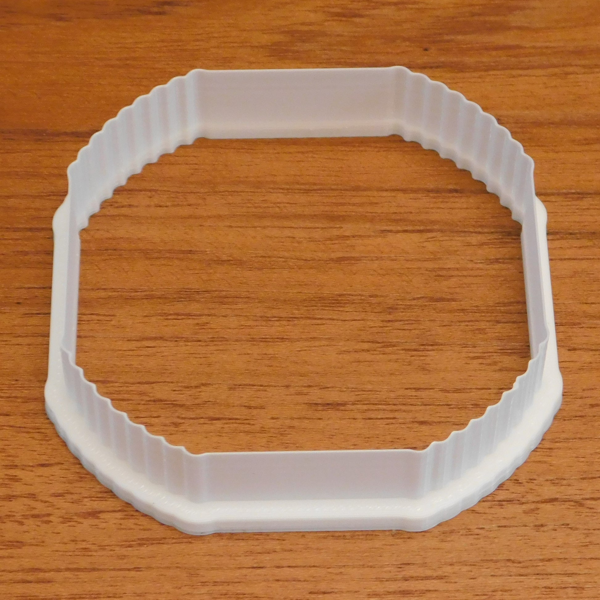This die extrudes a shape that is a square with rounded corners. The corners also have vertical ridges on the outside. It fits in 4" square North Star and TA Metal Works clay extruders.