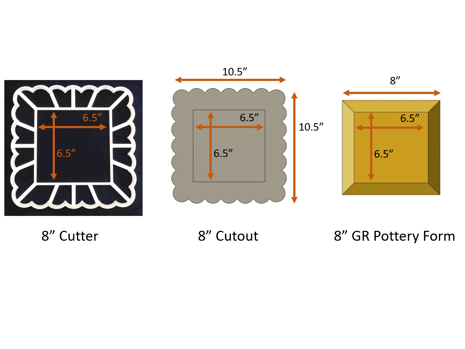 The cutter is available in sizes to fit the 3 1/2", 4", 5", 6 1/2", 8", 9 1/2", and 11" square wooden forms by GR Pottery.